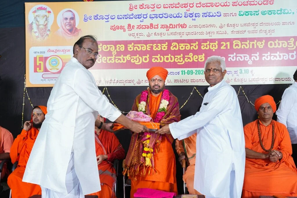 21ದಿನಗಳಲ್ಲಿ ಕಲ್ಯಾಣ ಕರ್ನಾಟಕ ನಾಡಿನ 7 ಜಿಲ್ಲೆ, 48 ತಾಲೂಕಾದ *5000 ಕೀ ಮೀ ವಿಕಾಸ ಪಥ ಯಾತ್ರೆ* ಯಶಸ್ವಿಯಾಗಿ ಕೈಗೊಂಡು ಇತಿಹಾಸ ನಿರ್ಮಿಸಿ, *ಸೇಡಮ್ ಪುರ ಪ್ರವೇಶಗೈದ ಪೂಜ್ಯ ಸದಾಶಿವ ಸ್ವಾಮಿಗಳಿಗಳು.